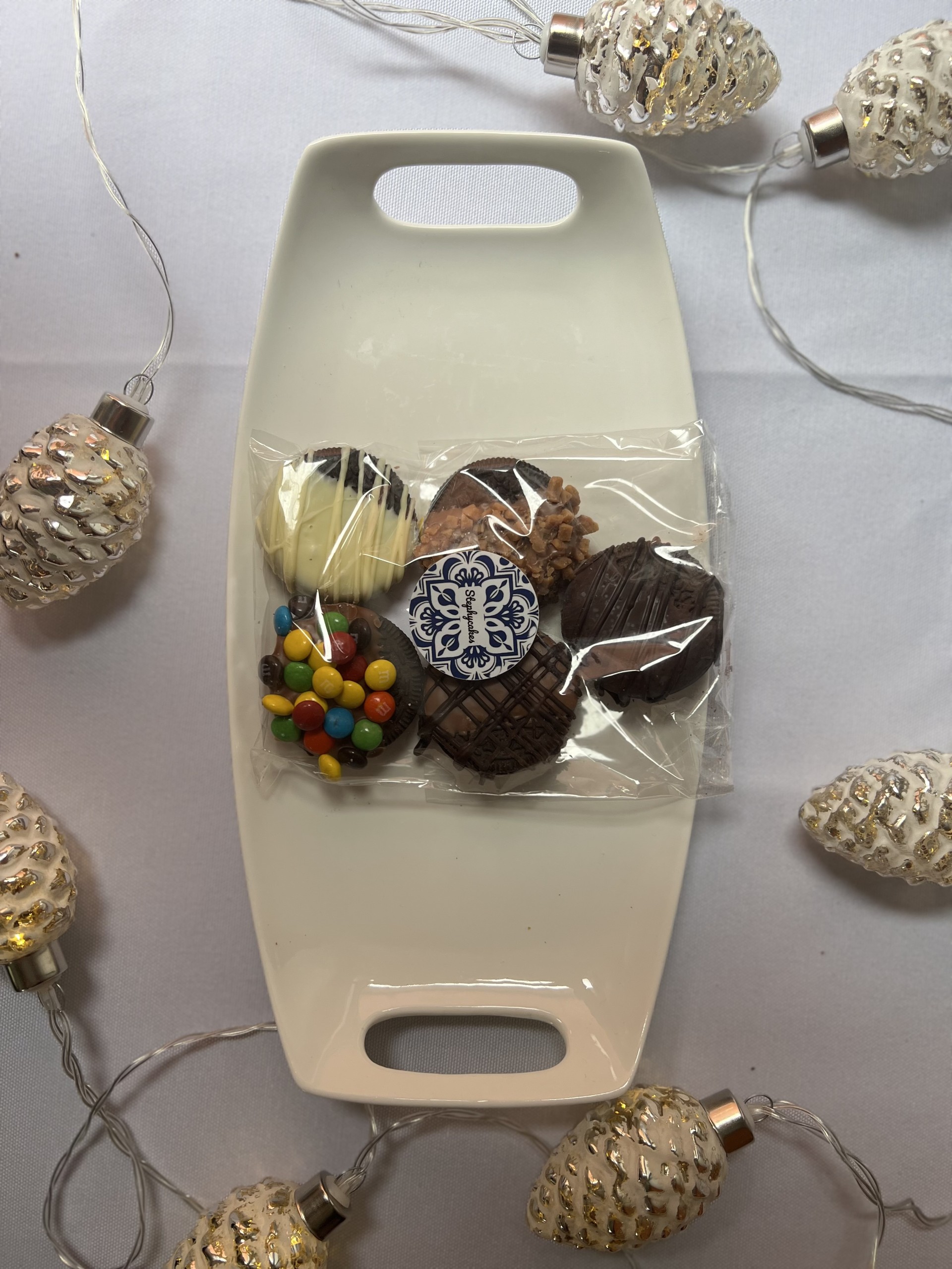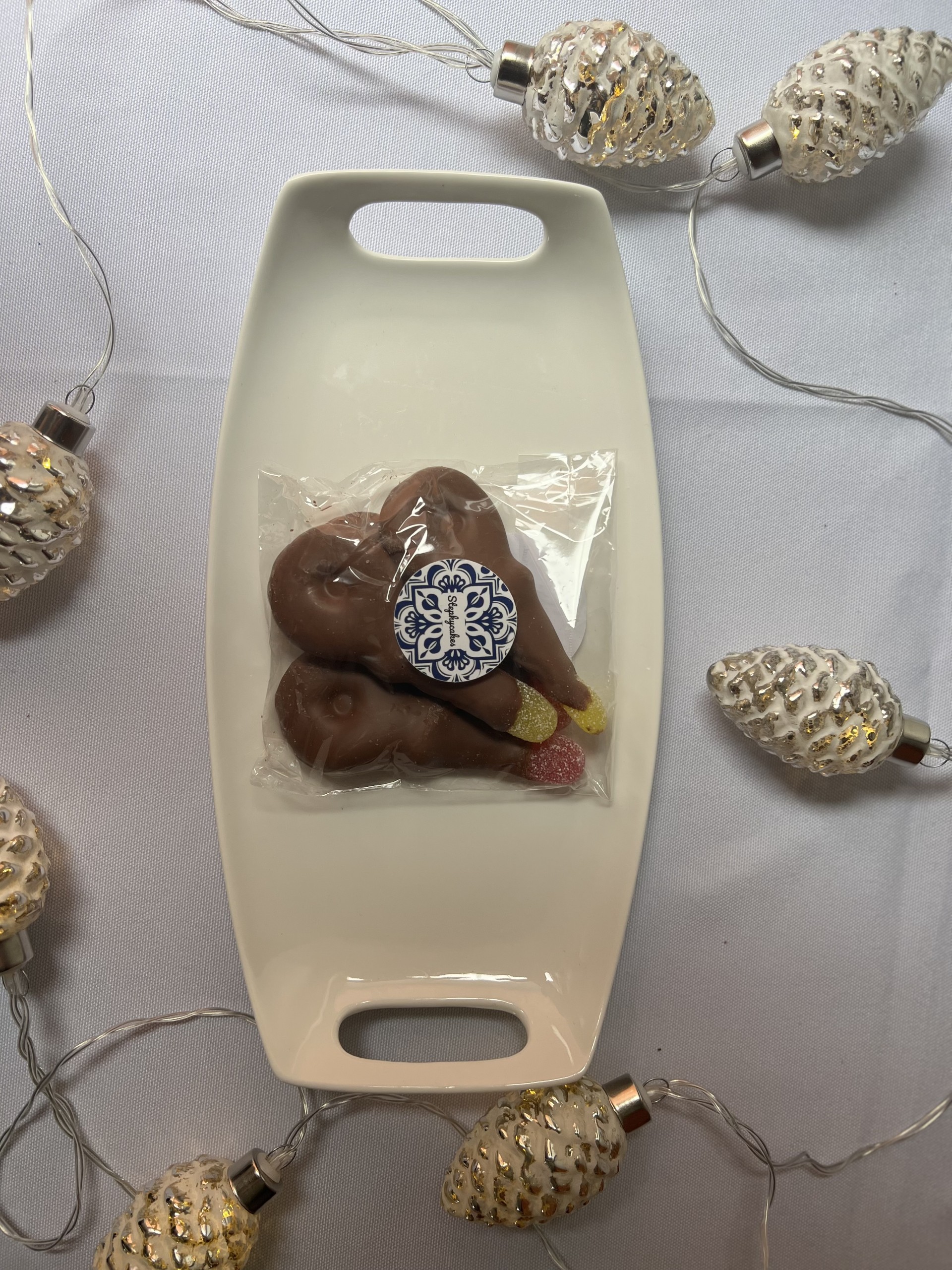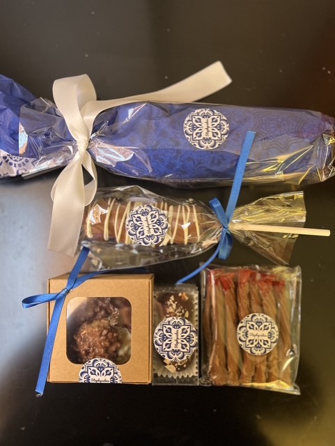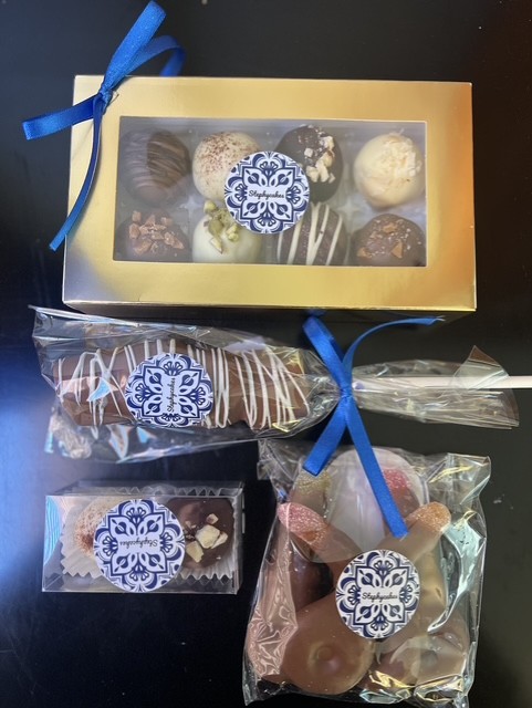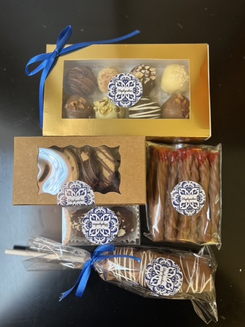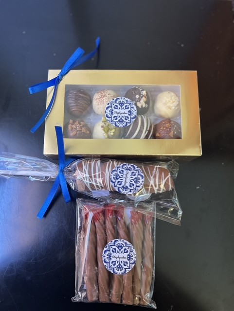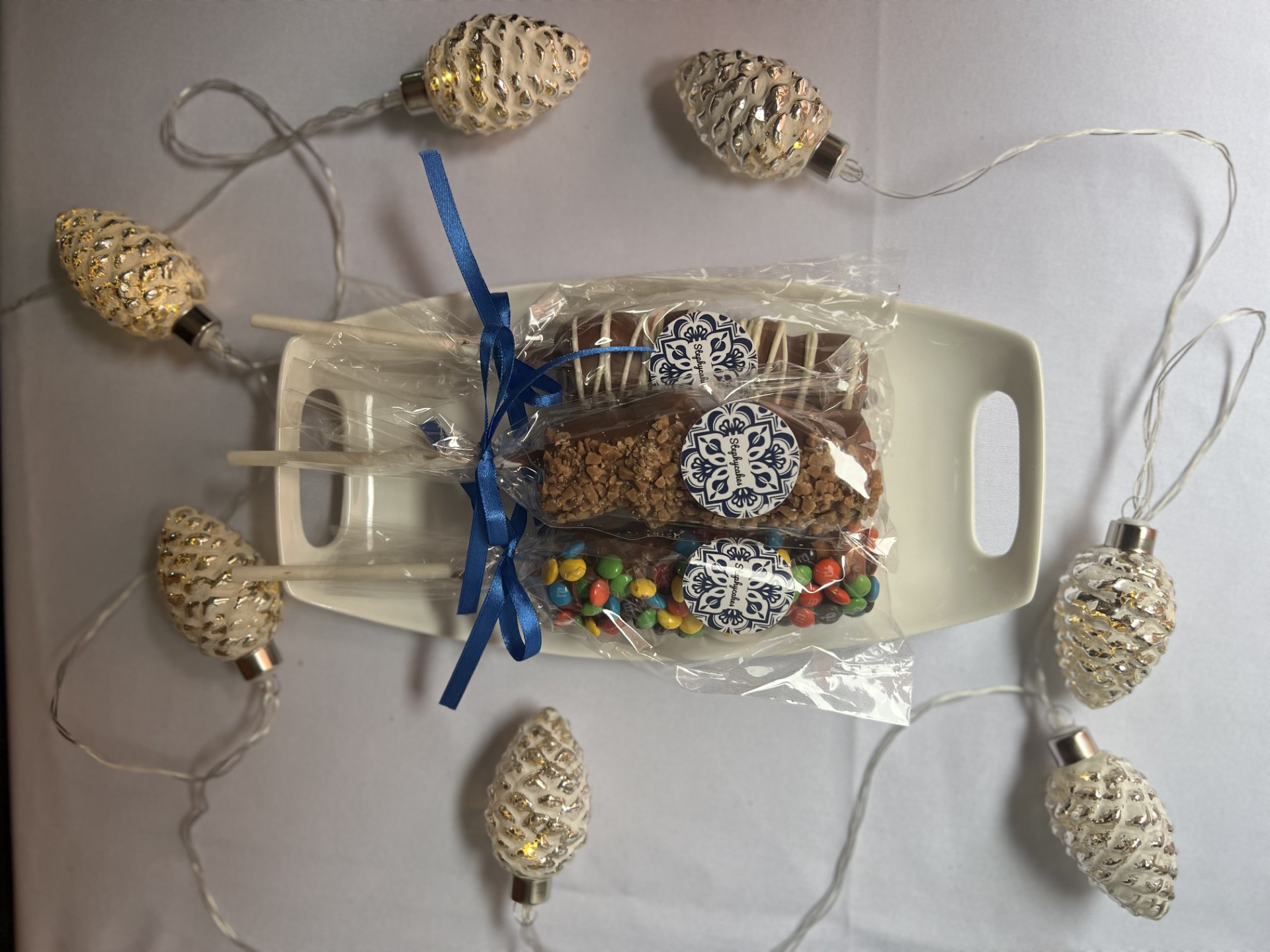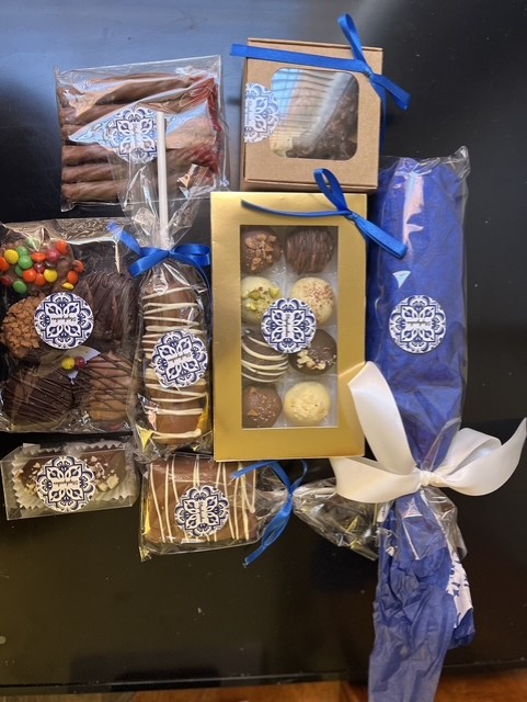 Includes a chocolate salami, 5 chocolate covered oreos, a chocolate covered marshmellow, a chocolate covered rice krispie, 2 pack of truffles, chocolate covered sourkeys or chocolate covered licorice and a 4 pack of clusters.