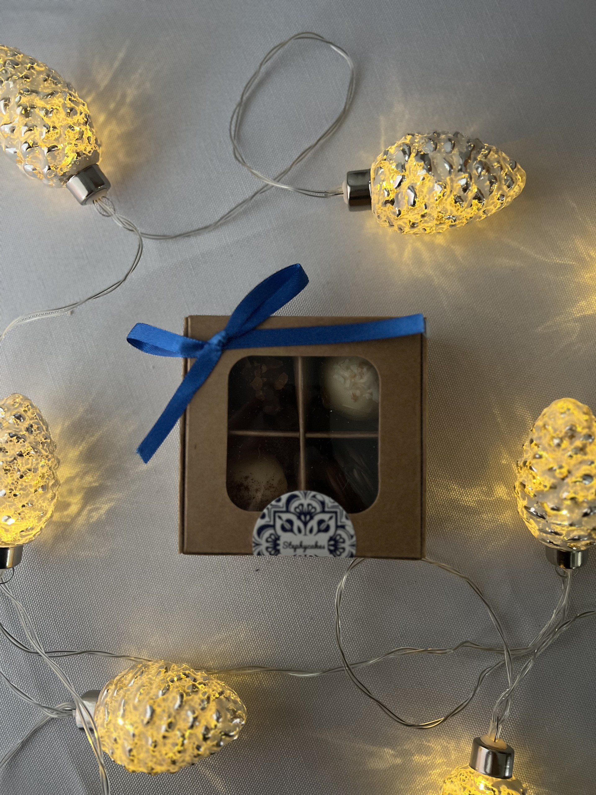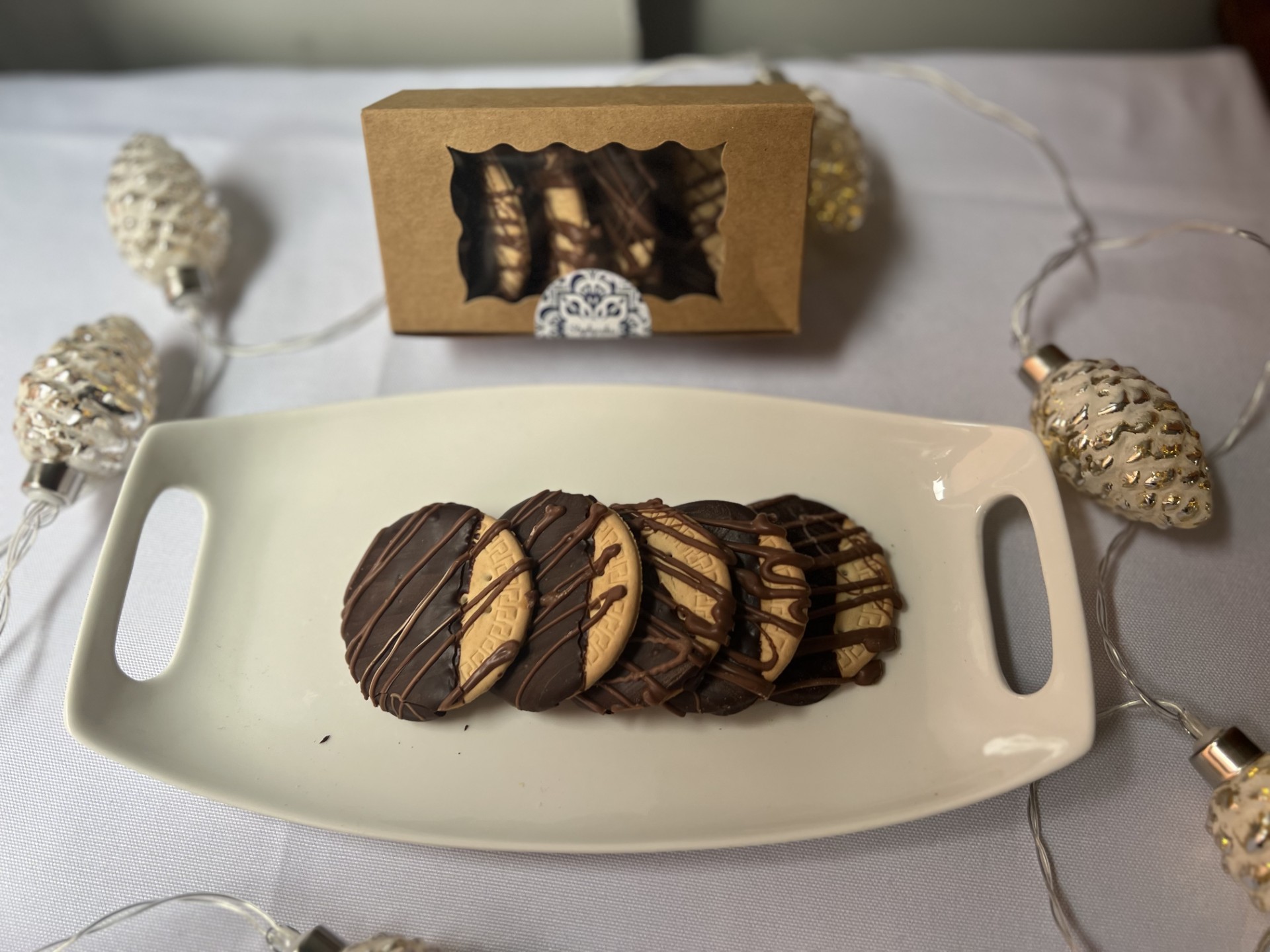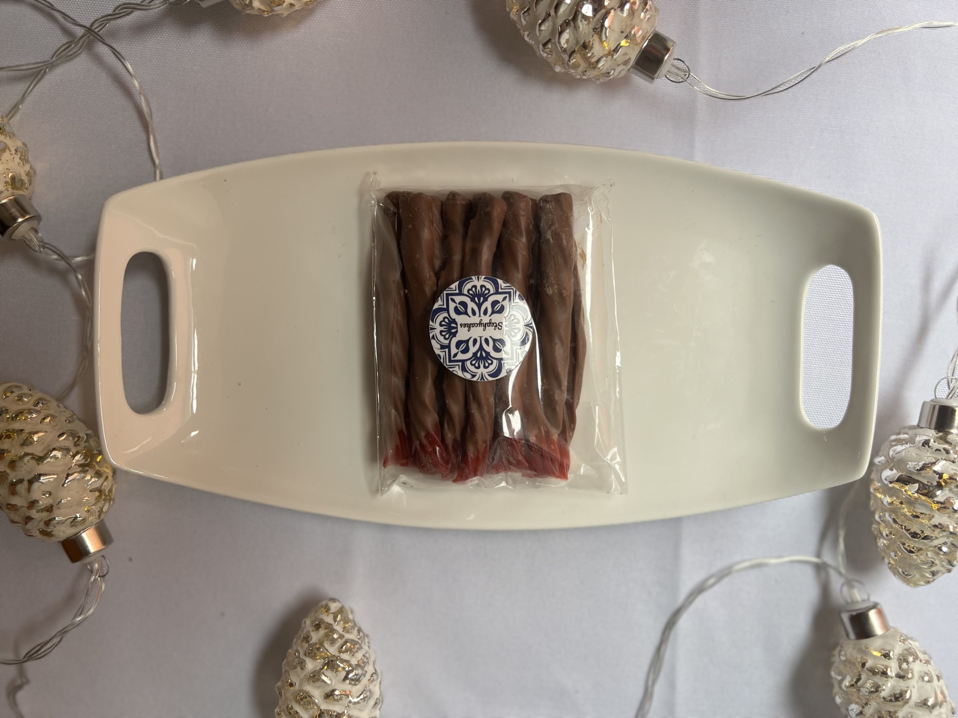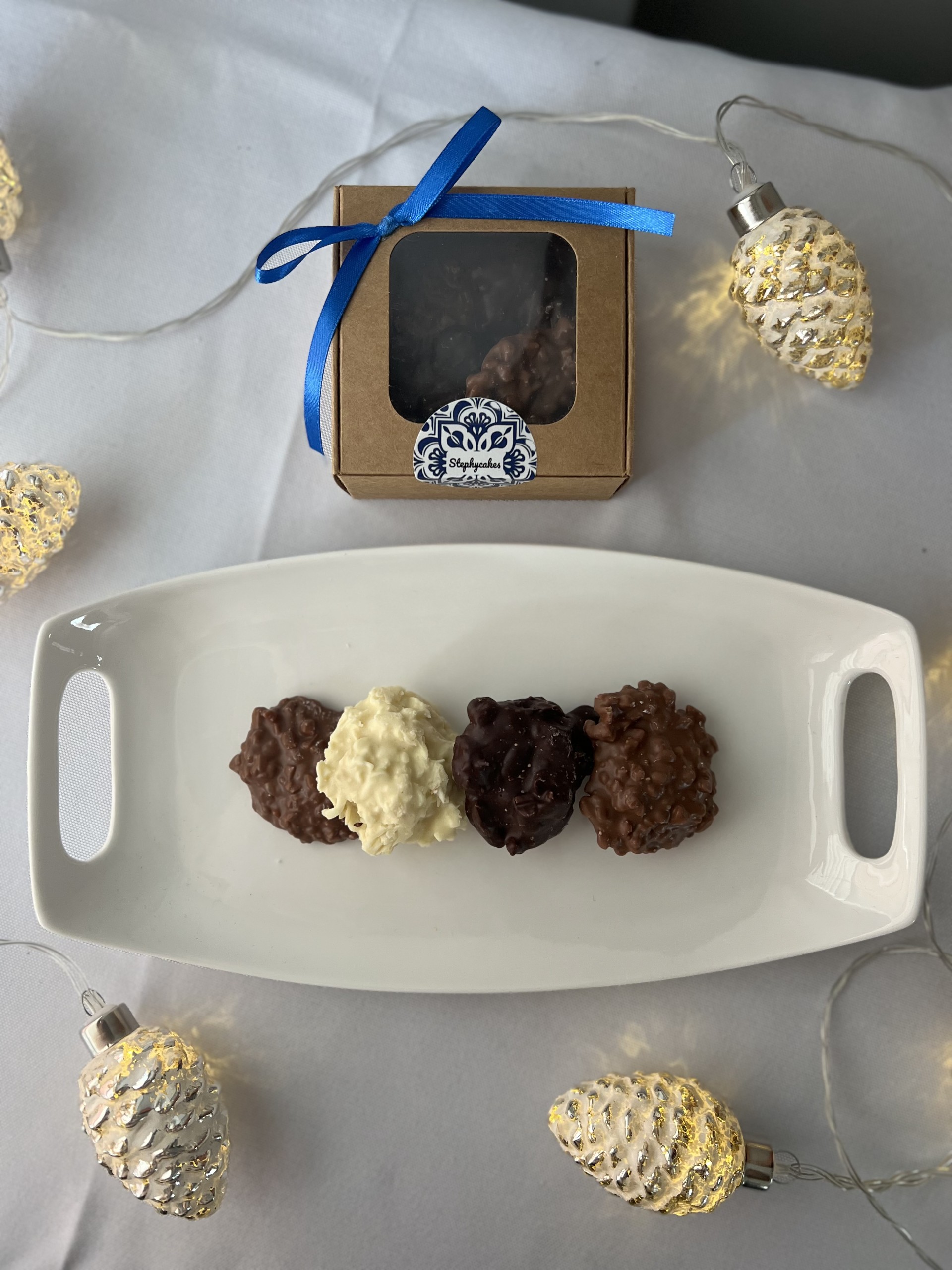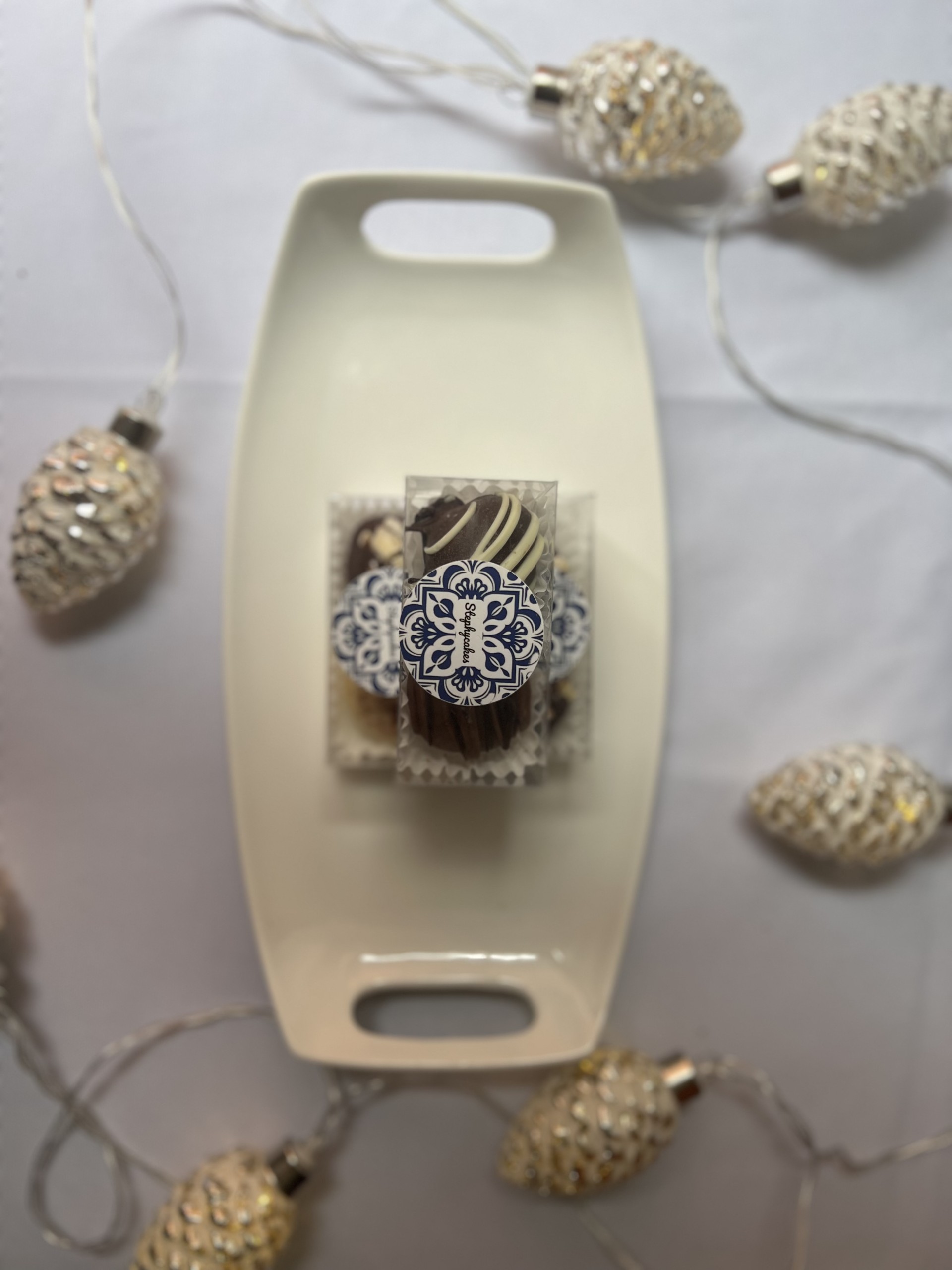 Includes a chocolate salami, 5 chocolate covered oreos, a chocolate covered marshmellow, a chocolate covered rice krispie, 2 pack of truffles, chocolate covered sourkeys or chocolate covered licorice and a 4 pack of clusters.