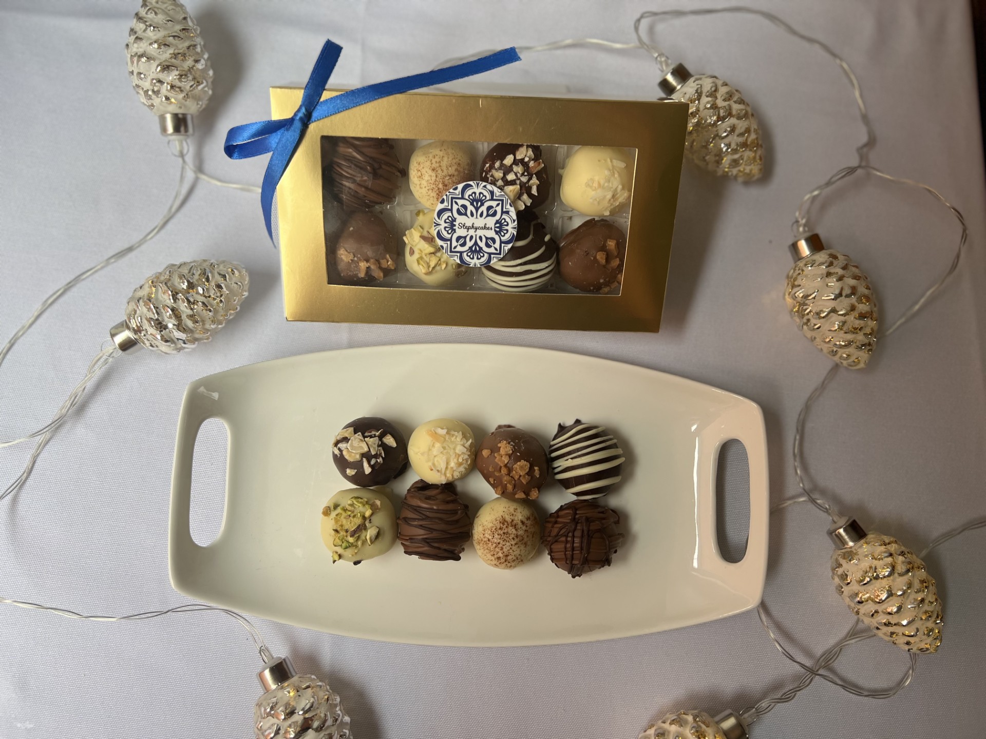 Includes 8 pack of truffles, chocolate covered marshmellow and choice of chocolate cover licorice or chocolate covered sourkeys